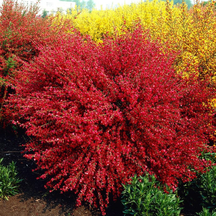 - Emerald foliage with dozens of ruby red flowers on upright stems from late spring to early summer