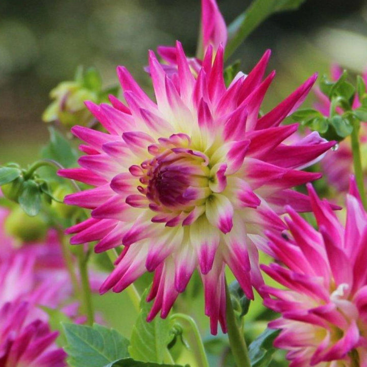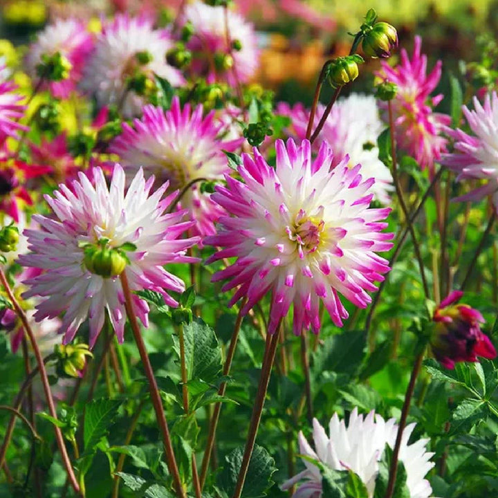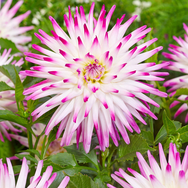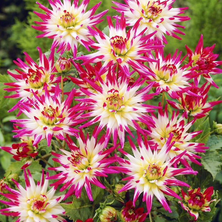 The Hayley Jane Dahlia is ideal for adding texture and vibrant colour to the garden. The creamy-white flowers boast sunny yellow centres and the petals feature fuchsia pink tips for extra visual interest.