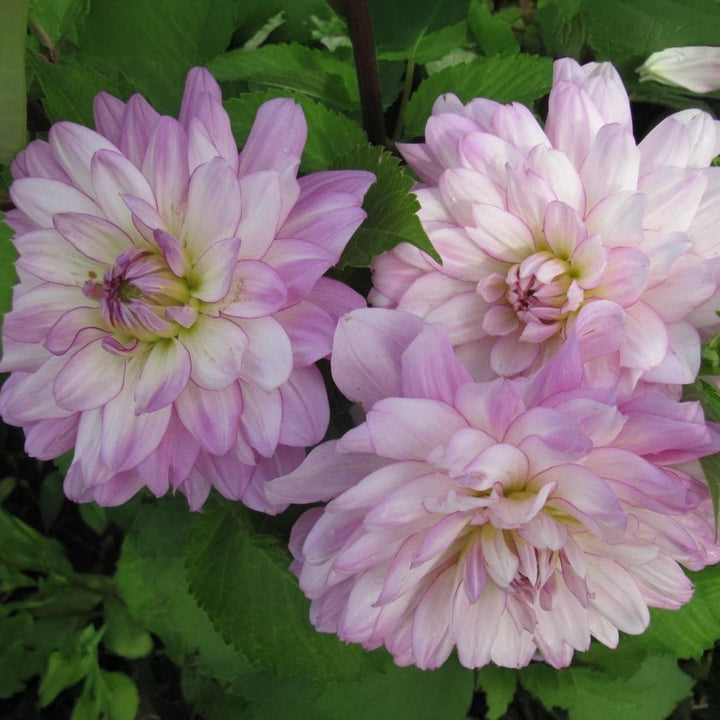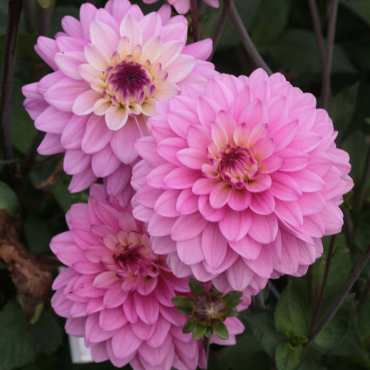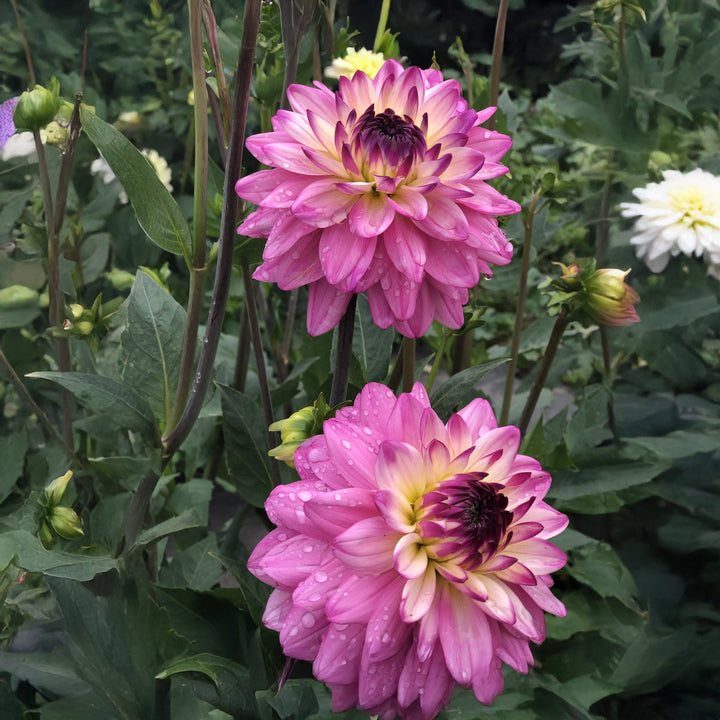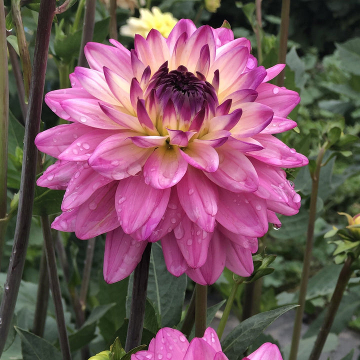 Tall, sturdy stems support the showy flowers of the Lucca Johanna Waterlily Dahlia. The blooms emerge in mid-summer and last until the first frosts. Each flower has a white centre that blends through pink shades into a pinkish shade of purple towards the edges of the petals.