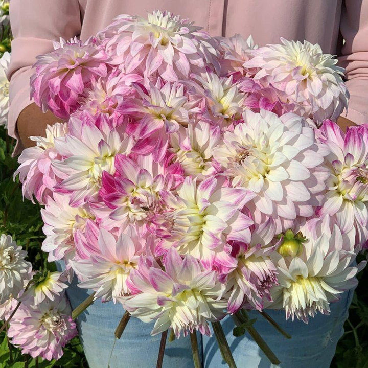 Pink Petticoat decorative dahlia bulbs are the perfect addition to any outdoor space. In mid-summer, young white flowers emerge, turning a beautiful shade of powder pink as they mature. This creates a striking bi-colour effect and ensures the display of blooms evolves throughout the long flowering season.