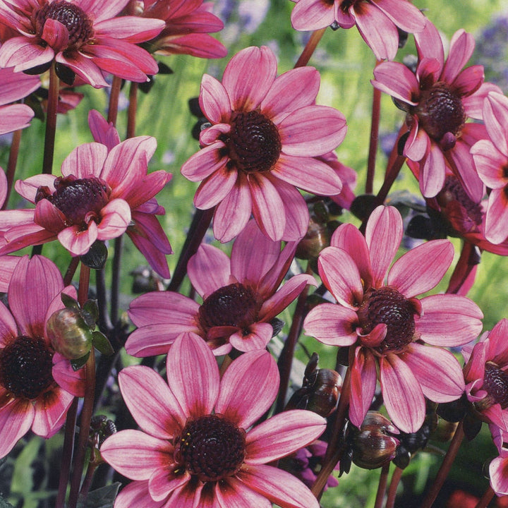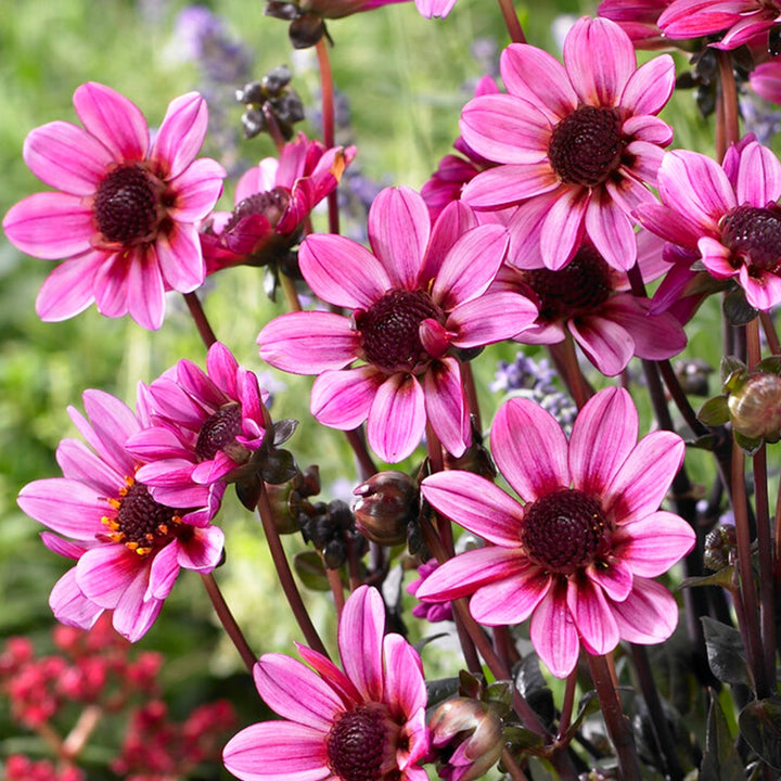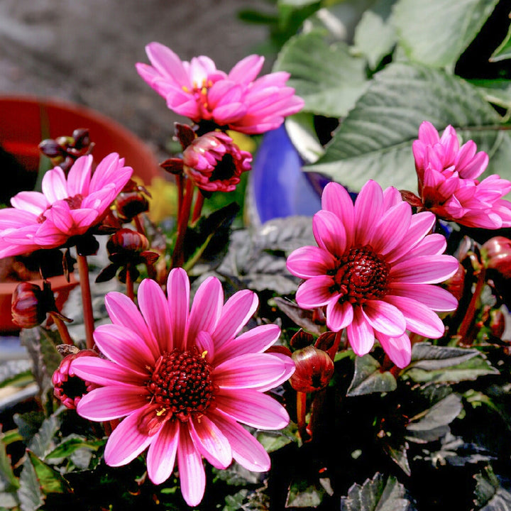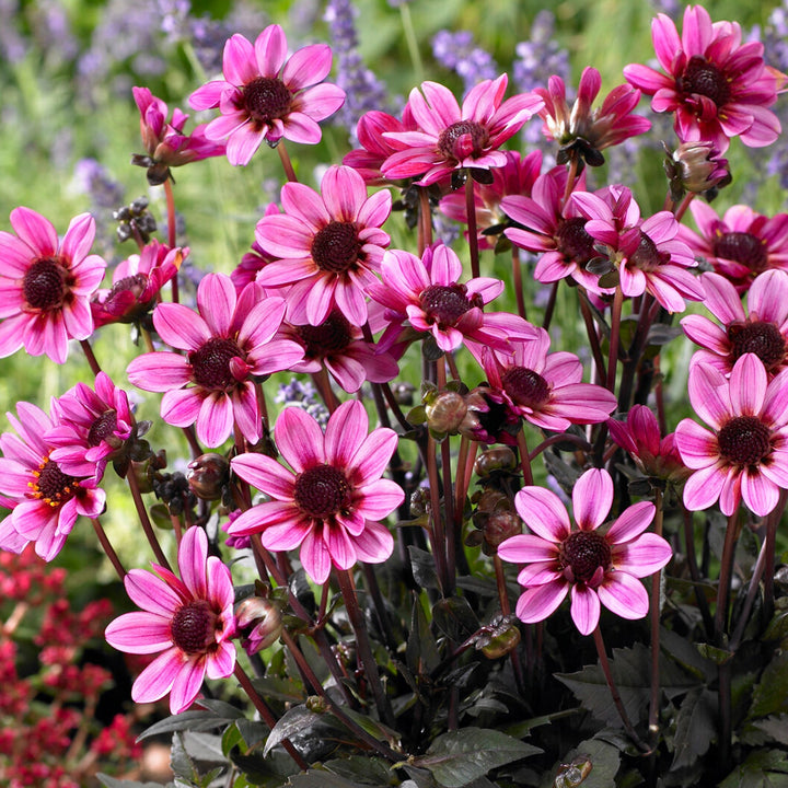 Pretty Women dahlia bulbs grow into compact perennials and produce single flowers with a deep purple-pink eye that turns golden yellow as it matures. This is surrounded by sugar-pink petals that fade from dark pink near the centre to a lighter shade towards the edges. The dark green foliage is flushed with bronze tones, perfectly complementing the pink hues of the flowers.