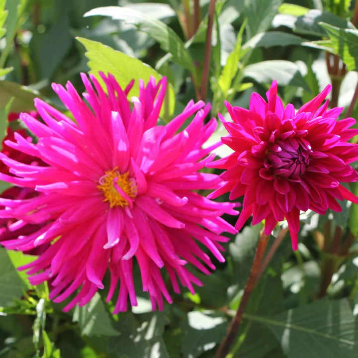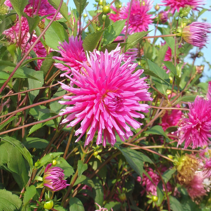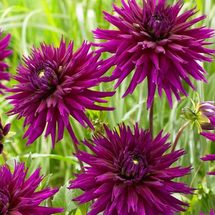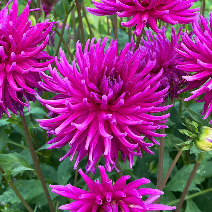 Dahlia Purple Gem certainly lives up to its name. Its spiky petals are a rich-purple hue, bright towards the edges and darkening to an almost burgundy colour towards the centre. The stems are also a deep shade of purple, contrasting beautifully with the mid-green foliage.