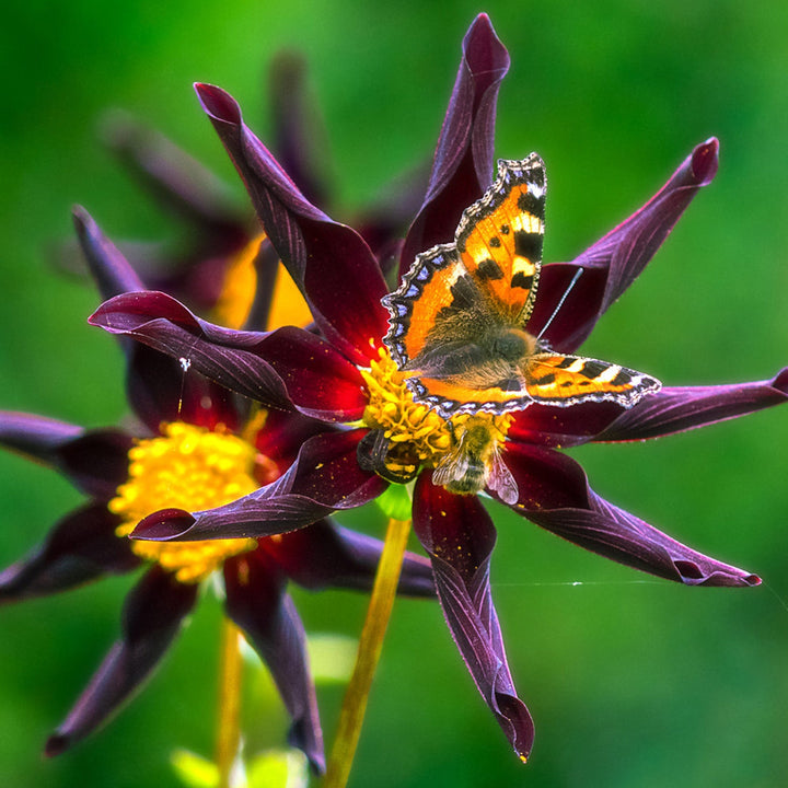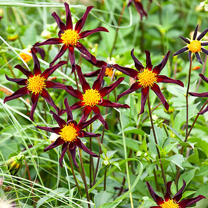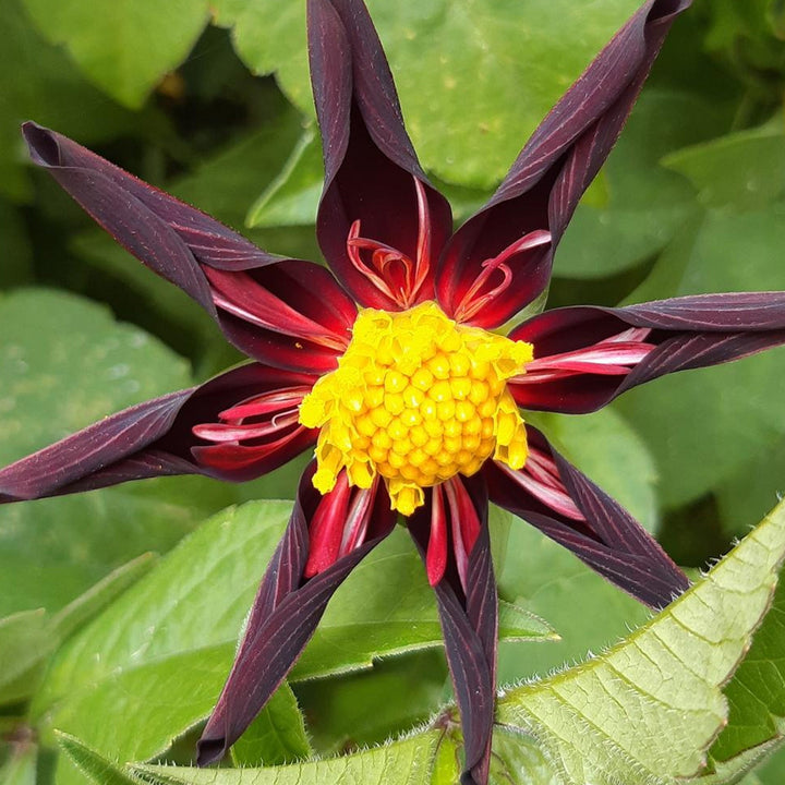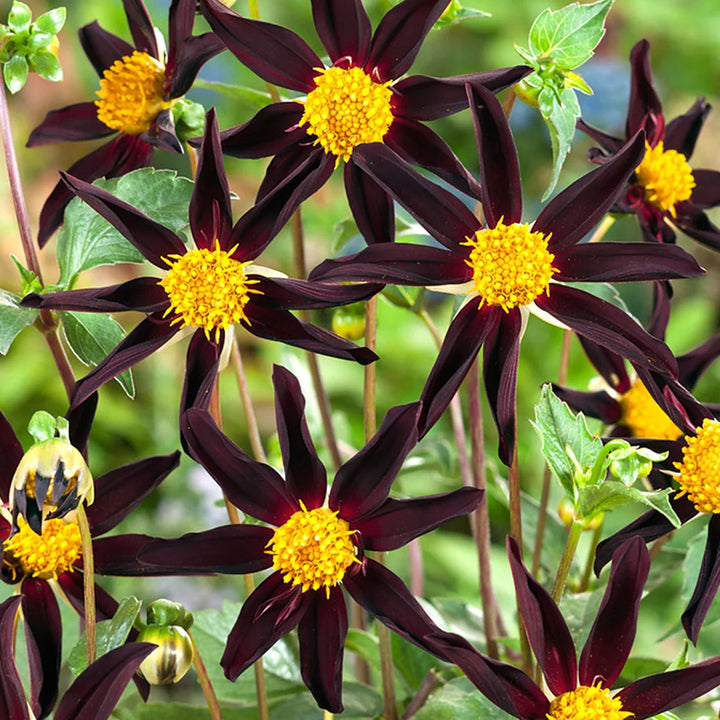 Verrone's Obsidian dahlia bulbs are also known by the names Star Dahlia and Cartwheel Dahlia. They feature a bright yellow eye in the centre, surrounded by a single row of purple-red petals that sometimes appear almost black, providing an amazing contrast.