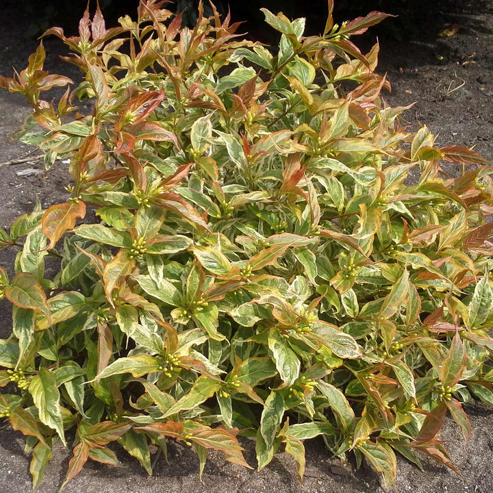 Diervilla rivularis 'Honey Surprise'® is a smallish deciduous shrub with very decorative foliage, that emerges bronze-orange in spring and then becomes cream and green variegated. Clusters of yellow honeysuckle-like flower appear in summer, attracting butterflies and bees. Ideal for a mixed border or a large patio container.