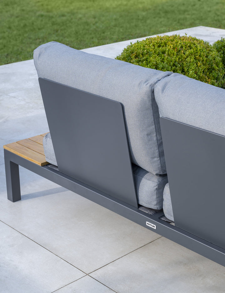 The sofa set features a weather-resistant aluminium frame with FSC-certified teak accents, making it both sturdy and attractive. The cushions are waterproof and have a 6cm foam core, ensuring long-lasting comfort and shape.
