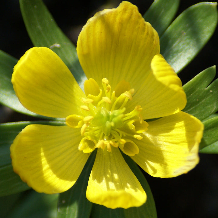 Eranthis are small tuberous perennials with palmately or pinnately lobed basal leaves and cup-shaped flowers held above a collar of deeply lobed stem leaves