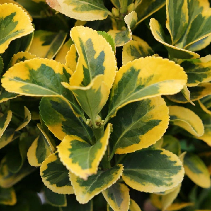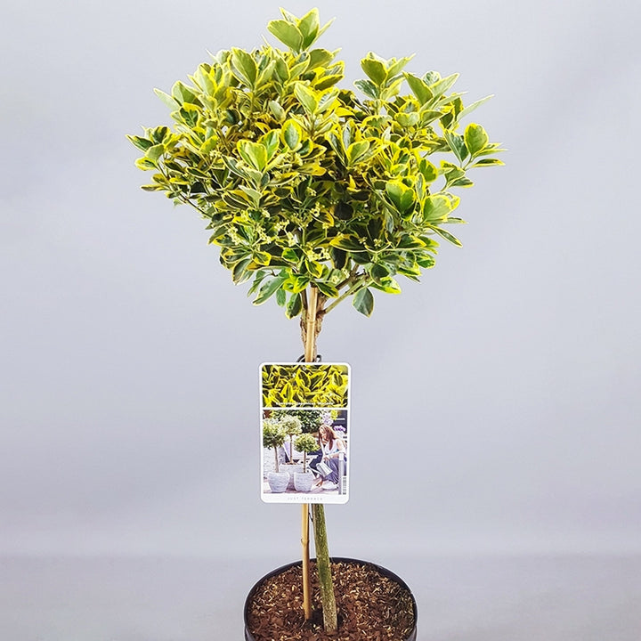 Euonymous 'Marieke' is a tree that will thrive all-year-round. They show off great colours throughout the year, with the olive-green colouring, joined by the yellow margins of the foliage. It will then be topped off at the end of the calendar year in Autumn when the tree forms pink fruiting. Potting this tree will make it stand out, perhaps being most effective positioned on your garden patio for visitors to see as they walk by.