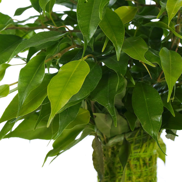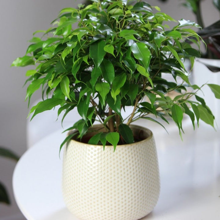 Ficus benjamina 'Kinky' is one of the most popular house plants available. Also known as 'weeping fig', this green leaved version is prized for its glossy foliage, which features deep dark green leaves and as they grow they will droop and overhang, giving off an attractive bushy effect. This variety is very adaptable and requires very little maintenance, requiring a slight trim to keep it's shape and only requires watering once a week and/or when the soil is partially dry. It is best to leave this plant in partial sun, as direct sunlight can potentially harm the plant. An added feature of this ficus is how it is used to filter toxins, it can extract pollutants like ammonia and formaldehyde and purify the air around it.