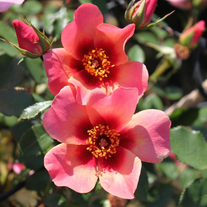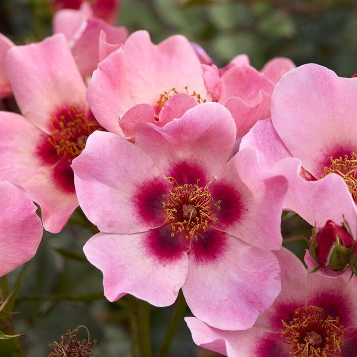- A lightly fragranced floribunda rose with candy pink petals surrounding a darker blotched centre and golden stamens