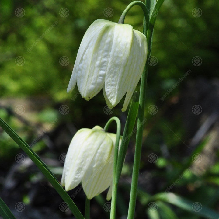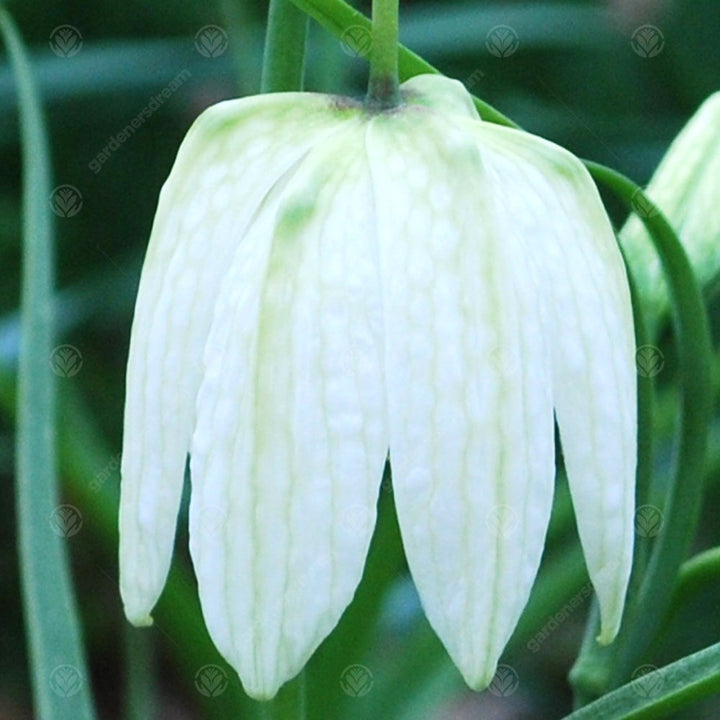 Fritillaria Meleagris Alba are bell or pendant-shaped flowerheads of creamy, pale whites with checkered or snakeskin-like patterned flowerheads that is very subtle and more visible with the light green hues in the mid-rib of petals. Thin, grass-like foliage accompanies this unique white display of blooms