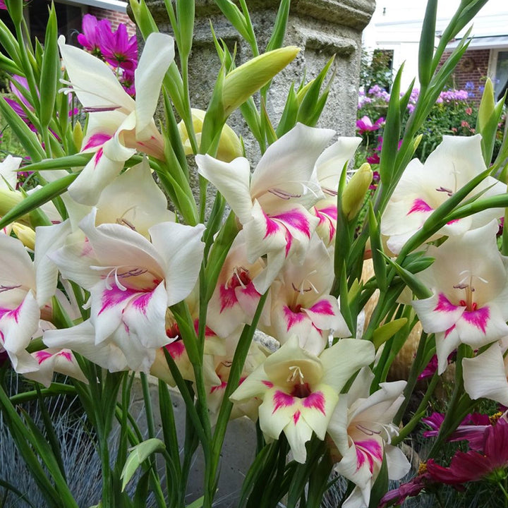Gladiolus Carine is a versatile addition to the garden, suitable for both formal and informal settings. Its tall flower spikes are perfect for adding vertical interest, and the vibrant blooms can be enjoyed both in the garden and as part of indoor floral arrangements.