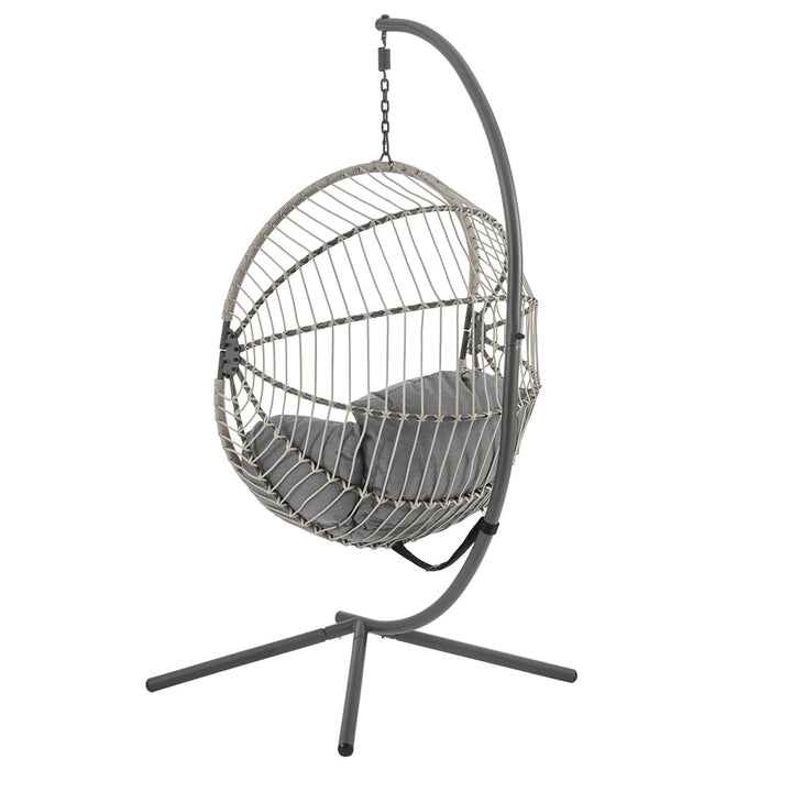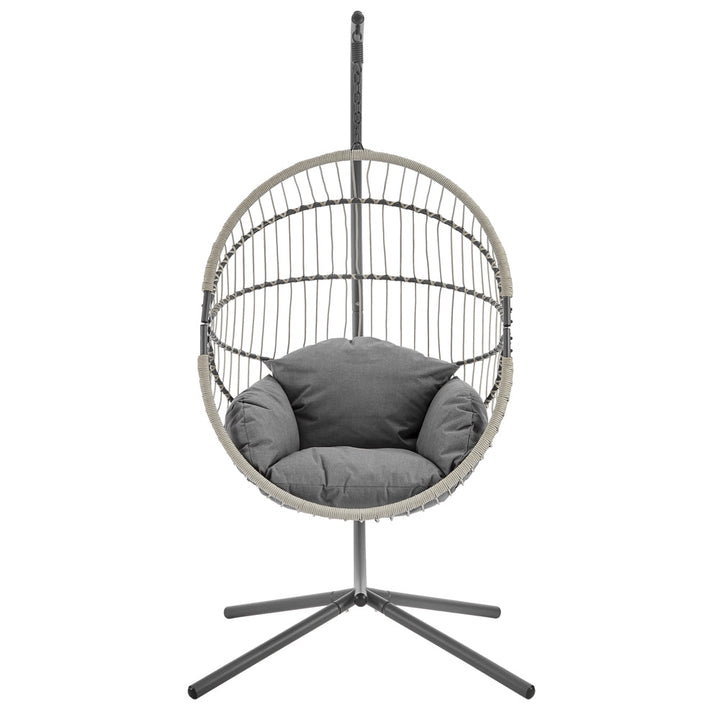 - Our Harrington hanging chair features durable grey faux rattan weaves combined with ropes hand woven and wrapped around strong steel frame with matching padded grey cushions.
