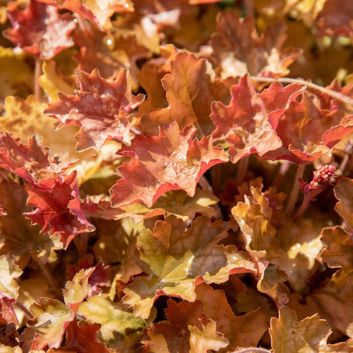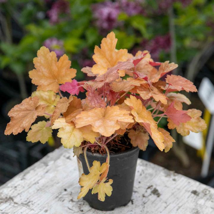 Heuchera ‘Ginger Ale’ is ideal for brightening up shady areas and looks great in pots, with its colourful foliage providing year-round appeal.