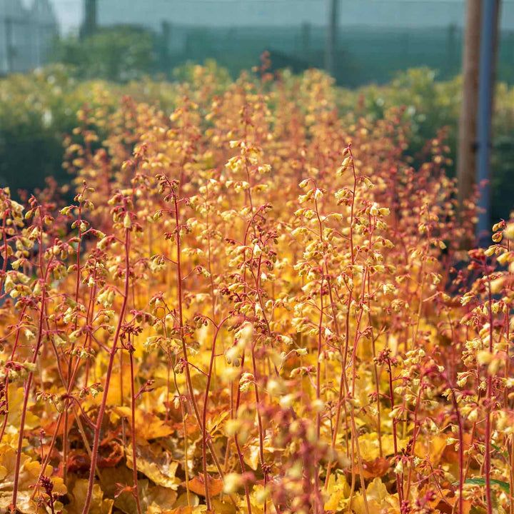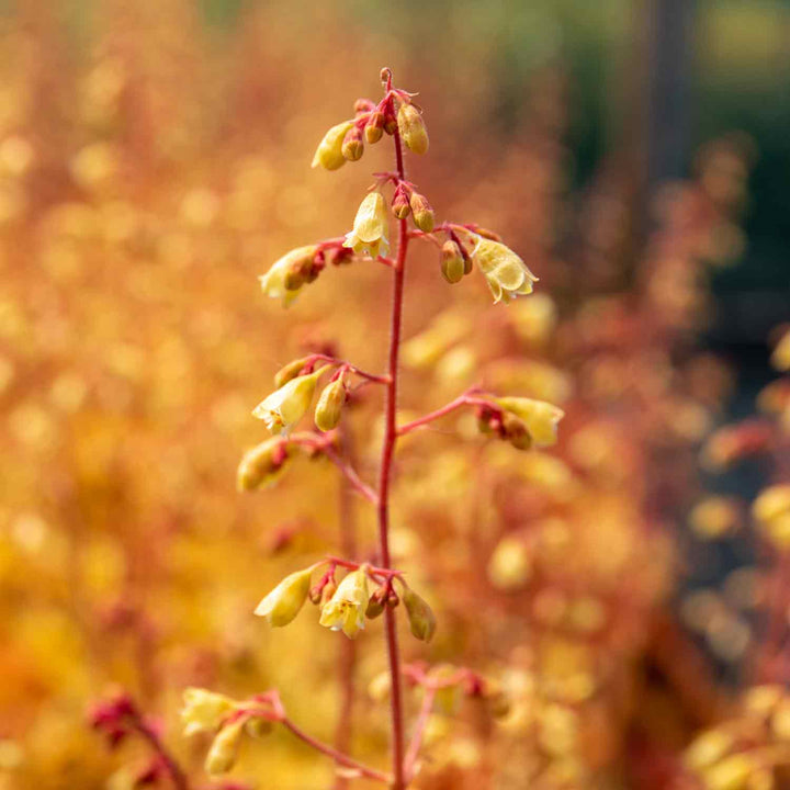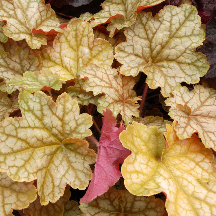 Evergreen perennial Heuchera ‘Ginger Ale’ has beautiful veined ginger-gold leaves with striking pink undersides. It flowers in summer, producing tall stems with sprays of small pink-tinged yellow flowers that are very popular with bees.