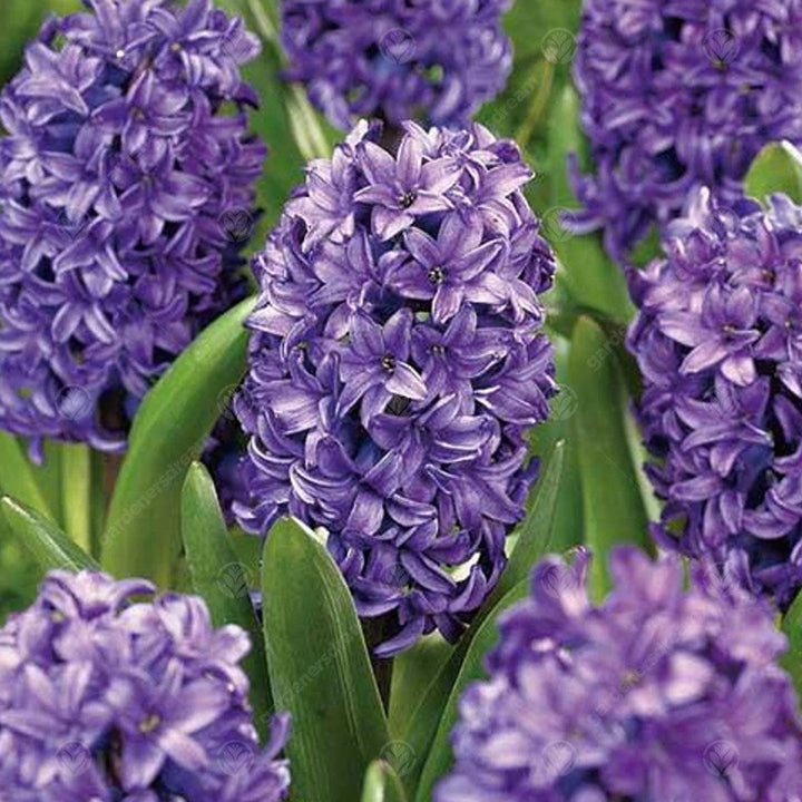 Hyacinths (Hyacinthus orientalis) are composed of clusters of small, bell shaped flowers with curved petals and are often very fragrant. Leaves are long, narrow and a dark green colour. Hyacinth blooms form in a variety of colours, from vibrant pinks to deep blues. Flowers on Hyacinths grow on racemes of dense clusters on single stalks.