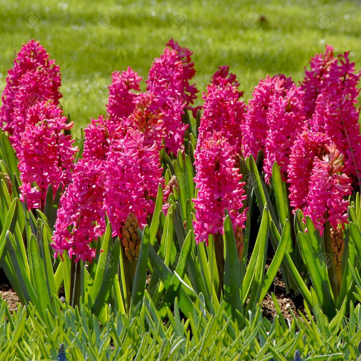 Hyacinths (Hyacinthus orientalis) are composed of clusters of small, bell shaped flowers with curved petals and are often very fragrant. Leaves are long, narrow and a dark green colour. Hyacinth blooms form in a variety of colours, from vibrant pinks to deep blues. Flowers on Hyacinths grow on racemes of dense clusters on single stalks.