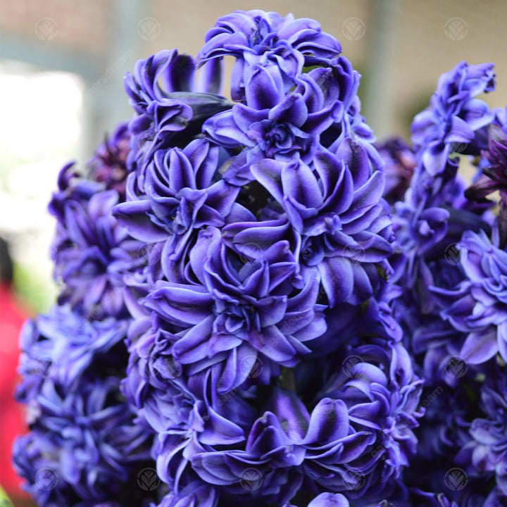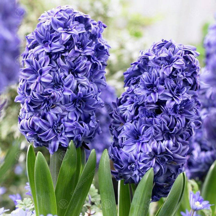 Royal Navy produces numerous star-shaped, packed with petals, double flowers on a raceme or a central spike rising from the bulb. Sweetly perfumed, double flowerheads are deep navy blues to purples, often with a darker hued stripe in the middle of each petal. Foliage consists of long leaves that are dark green, narrow and oblong with slightly inwardly curling edges.