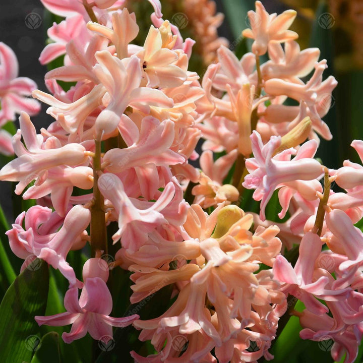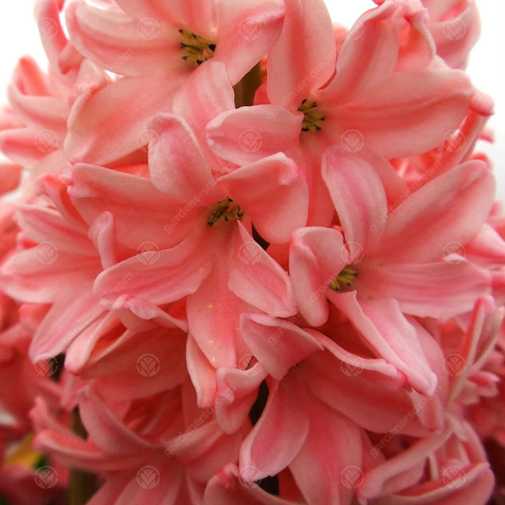 Hyacinths (Hyacinthus orientalis) are composed of clusters of small, bell shaped flowers with curved petals and are often very fragrant. Leaves are long, narrow and a dark green colour. Hyacinth blooms form in a variety of colours, from vibrant pinks to deep blues. Flowers on Hyacinths grow on racemes of dense clusters on single stalks.