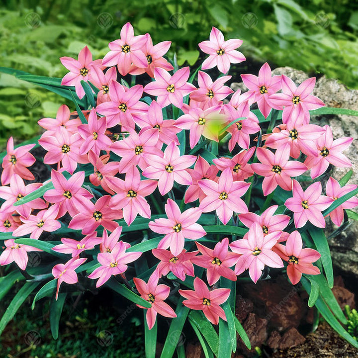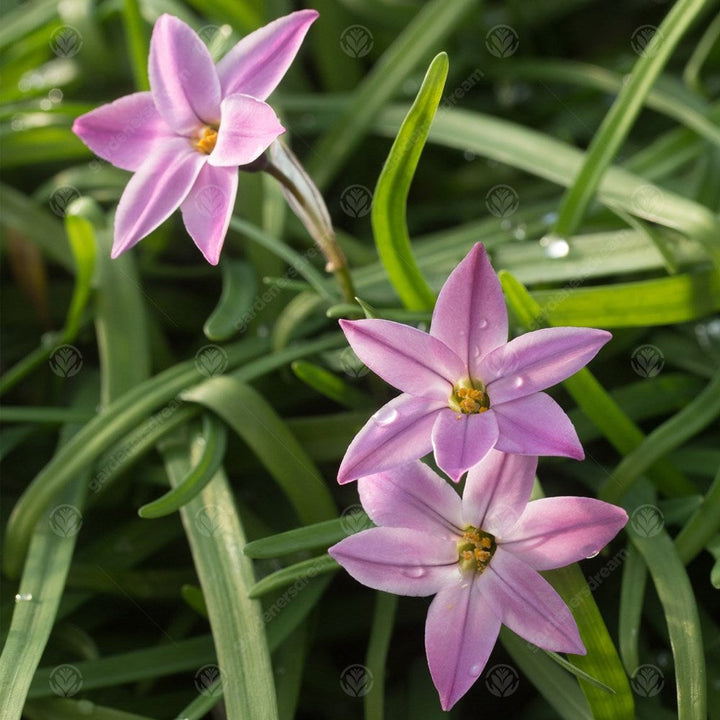 Ipheion Uniflorum Charlotte Bishop is a fragrant star-shaped bloom with wonderful pink petals with a darker pink stripe running in the middle of each petal and is accompanied by narrow and long mid-green leaves. Multiple stems grow from each bulb with flowerheads approximately 3-5cm in diameter.