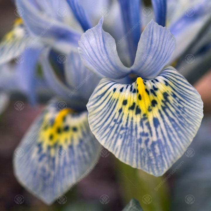 Iris Dwarf Katharine Hodgkin has single blooms with very unique colourations. Exterior sepals or autumns are coloured with grey- blue streaking or veining towards the margins and spotted towards the centre. Each sepal has a central golden yellow spot. Interior petals or standards have deep blue veining on a pale petal that appears almost translucent and feather-like. Accompanied by slender four-sided mid-green leaves.