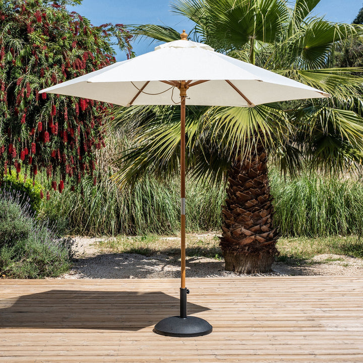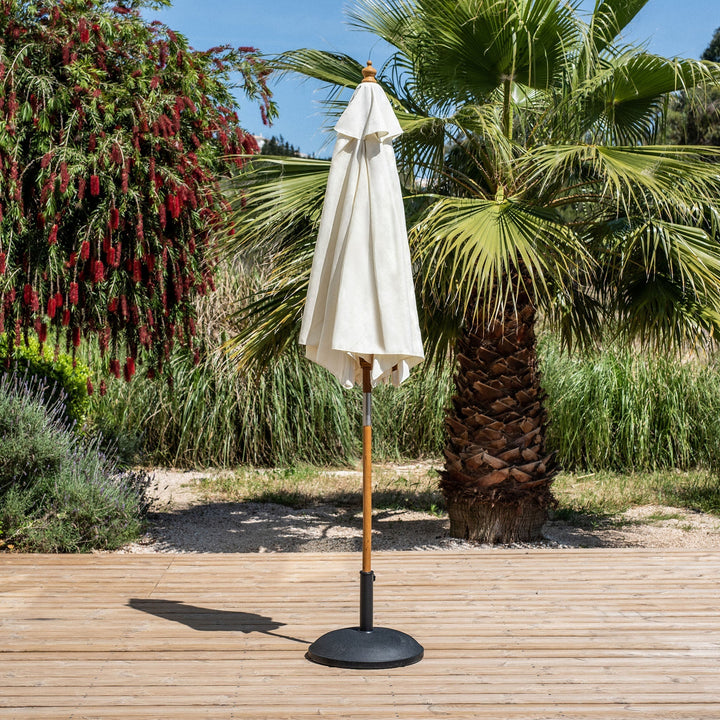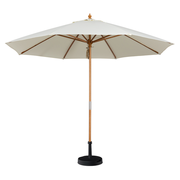 This Kratos 2.5m Wooden Parasol is a collapsible round parasol in Beige, operated by a pulley system which can be used with either a Dining Table or as a standalone Parasol with a base.