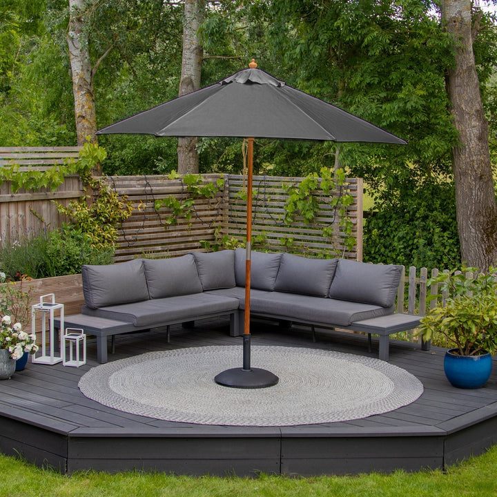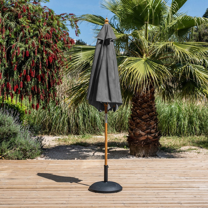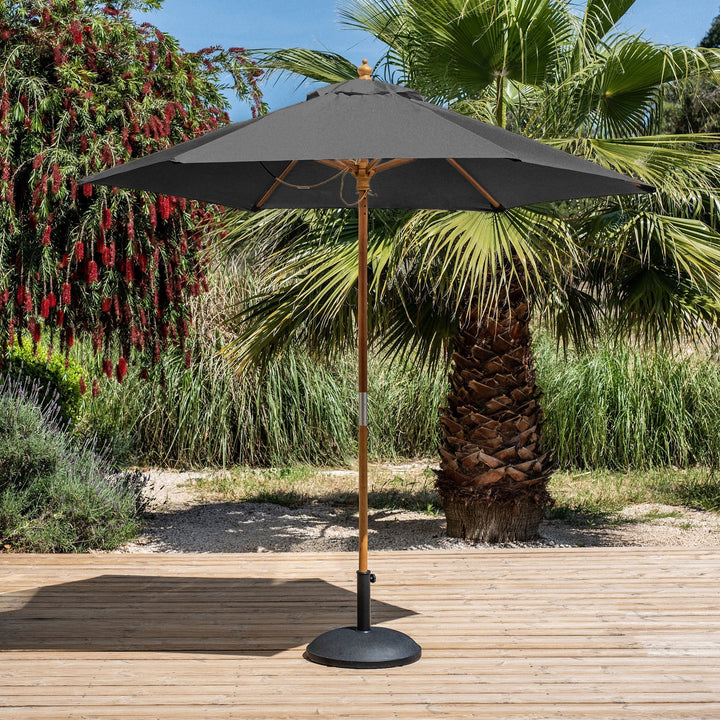 This Kratos 2.5m Wooden Parasol is a collapsible round parasol in Grey, operated by a pulley system which can be used with either a Dining Table or as a standalone Parasol with a base.