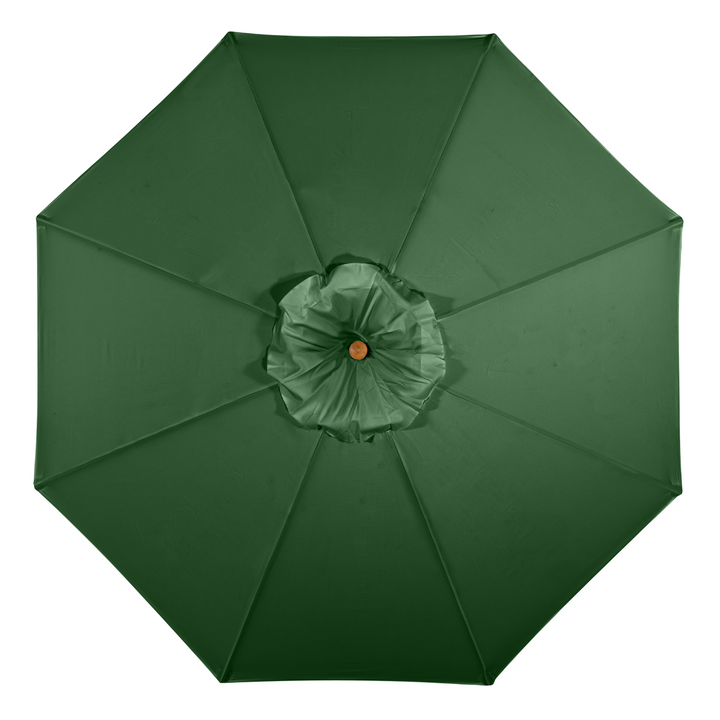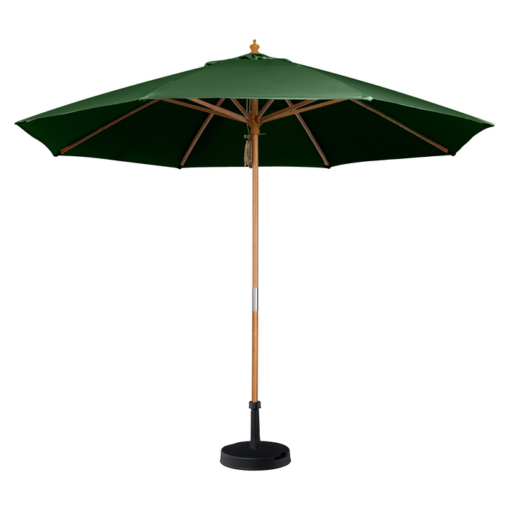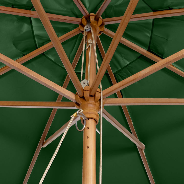 This Kratos 3m Wooden Parasol in Green is a collapsible round parasol, operated by a pulley system which can be used with either a Dining Table or as a standalone Parasol with a base.