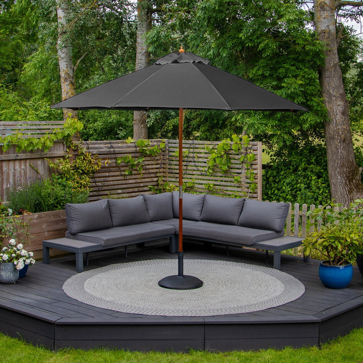 Supported by a strong ribbed frame the 38mm pole will fit through most standard dining tables. Our 3m Parasol is best for free standing or alternatively for a 6-8 seat dining set.