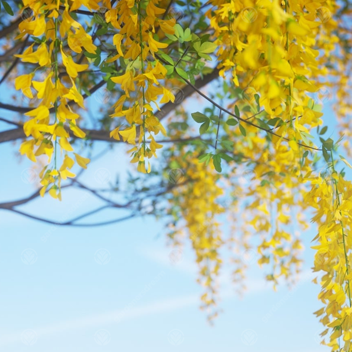 Laburnum ‘Vossii’ also known as Voss’s Laburnum, Golden Chain or Golden Rain is a large, captivating cultivar with a deep green foliage and a striking dark green bark. Masses of long, pendulous racemes of lightly scented, bright yellow flowers hang from all over the tree in the late Spring.