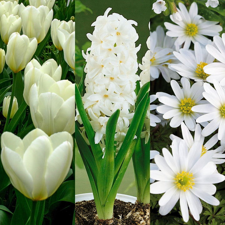 Pack Contents: 15 Tulip Fosteriana Purissima bulbs 11-12, 5 Hyacinth Orientalis White Pearl bulbs 14-15, 10 Anemone Blanda White Splendour bulbs 5-7.