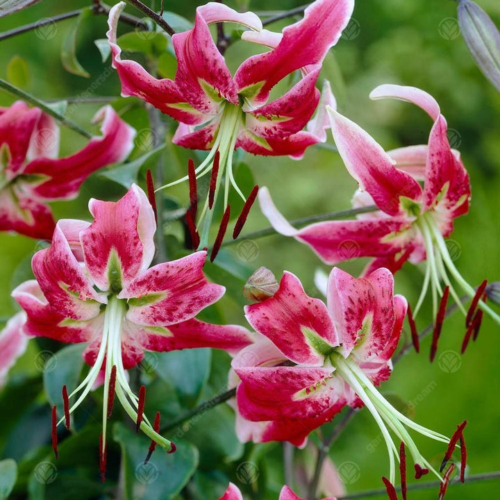 Black Beauty produces numerous blooms, over 100 on well established plants, of bright crimson reds with narrow white margins and green star-like centres. Large stamens with deep red to orange anthers protrude from the centre and the narrow stems that carry the blooms are often dark purple colours. Petals of the bloom open with widths of over 7cm.