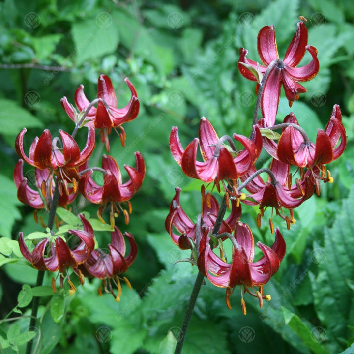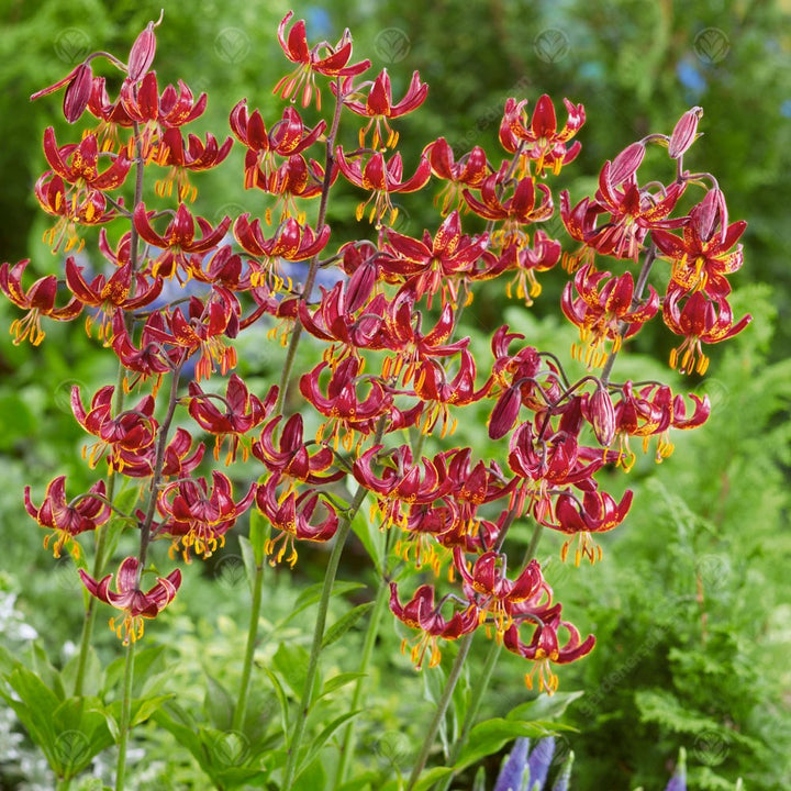 Claude Shride is Martagon Lily and each bulb produces multitudes of reflexed flowers on racemes, up to 20 per stem, with deep mahogany coloured petals with golden orange spotting. Golden orange anthers appear on long stamens and the plant has narrow, glossy dark green lanceolate-shaped foliage.
