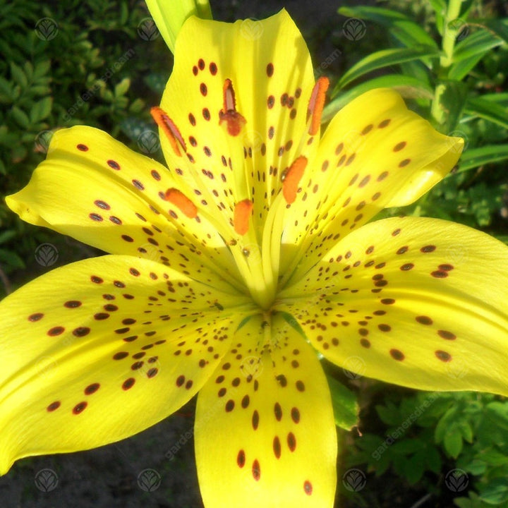 Yellow County is an Asiatic Lily and each bulb produces up to 12 bright golden yellow flowerheads, often with streaks of green closest to the base. Coppery red anthers appear on golden stamens and the plant has narrow, glossy dark green lanceolate-shaped foliage.