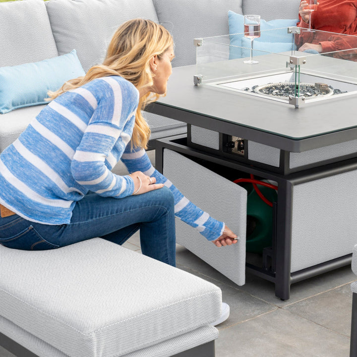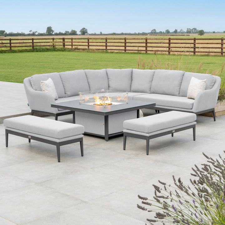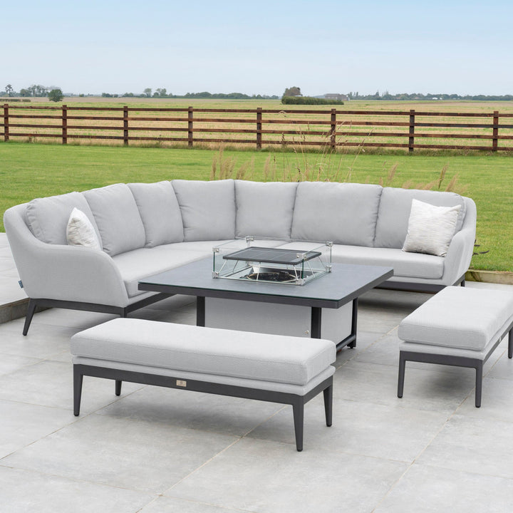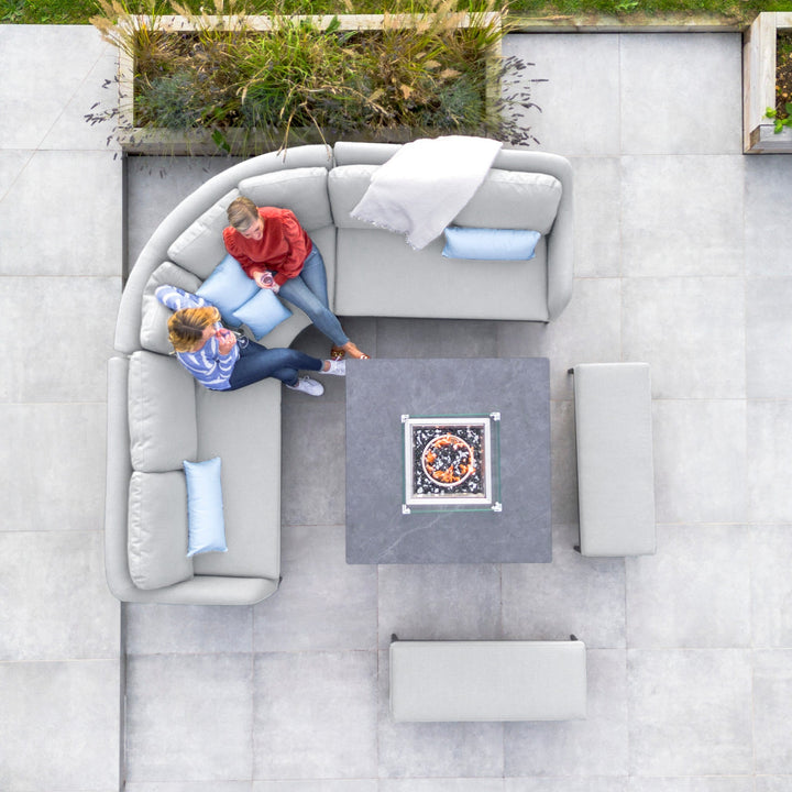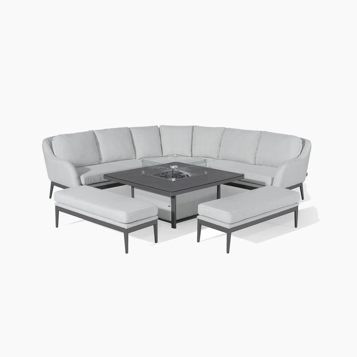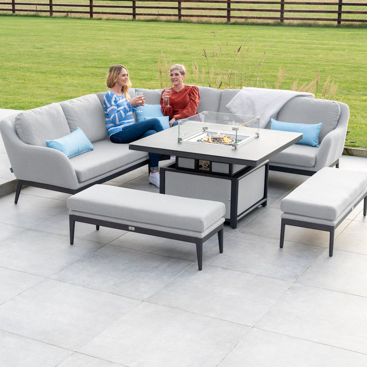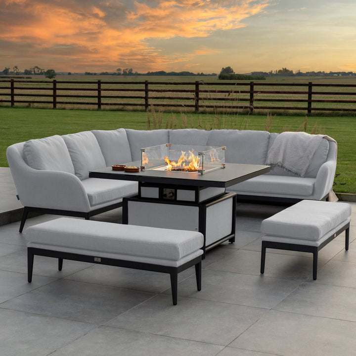 Luna Deluxe Outdoor Fabric Square Corner Dining Set with Rising Firepit Table in Oyster Grey