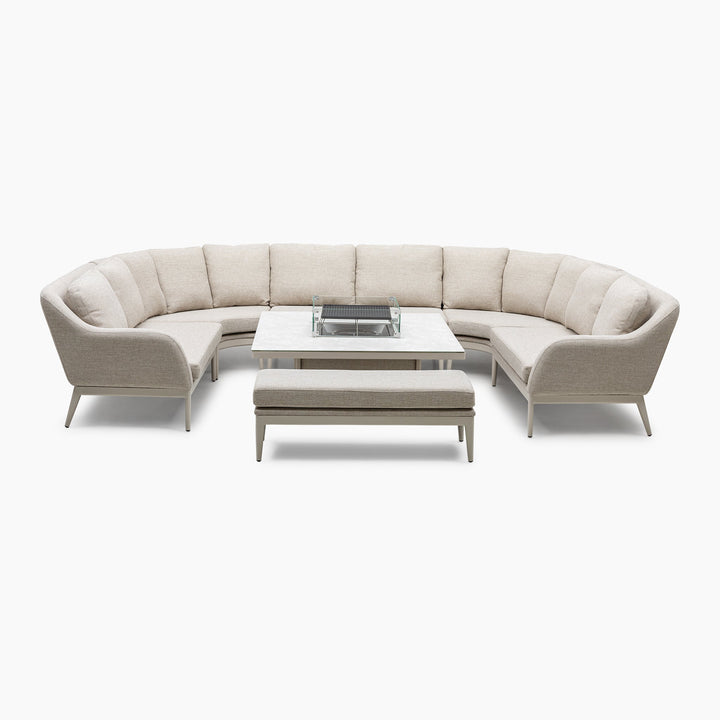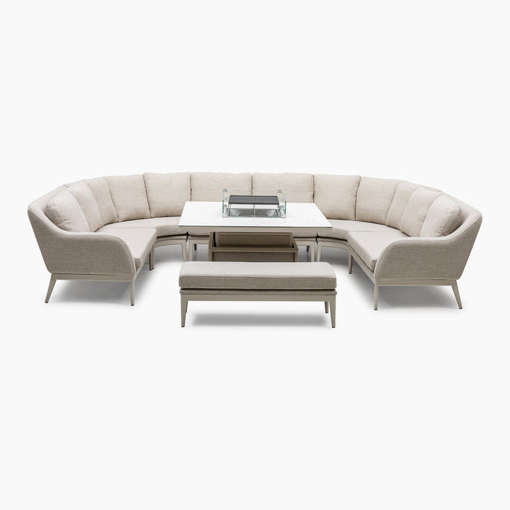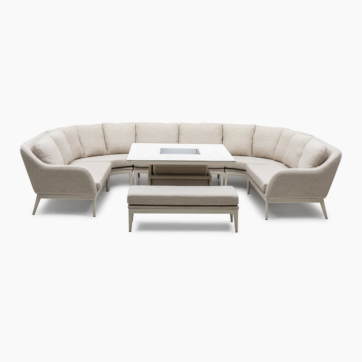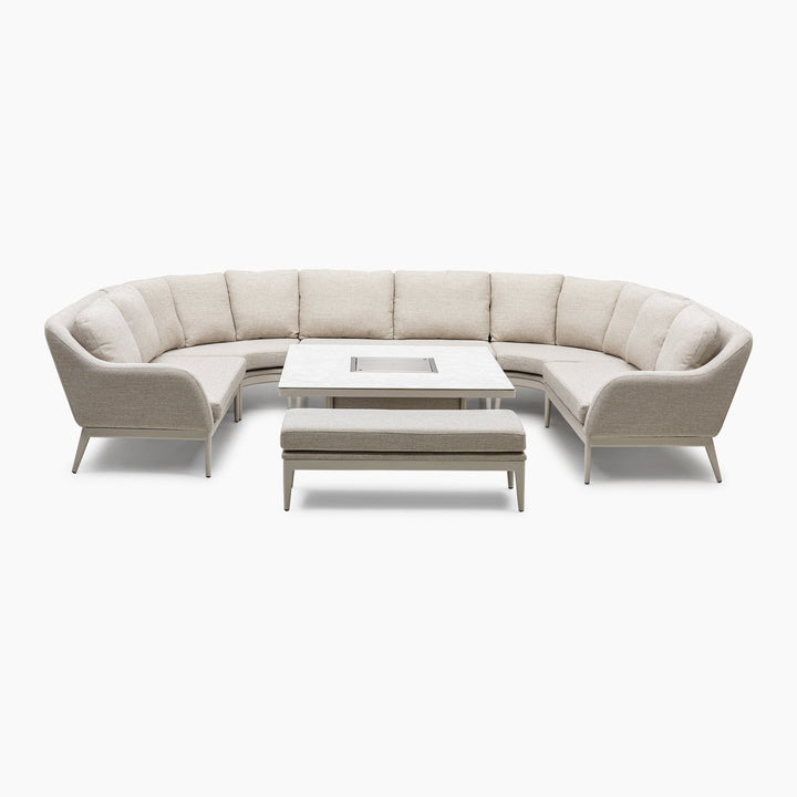The set contains a curved U-shape corner sofas made from outdoor fabric and an elegant rising firepit table. Designed to work perfectly both lounging or dining with the adjustable table.