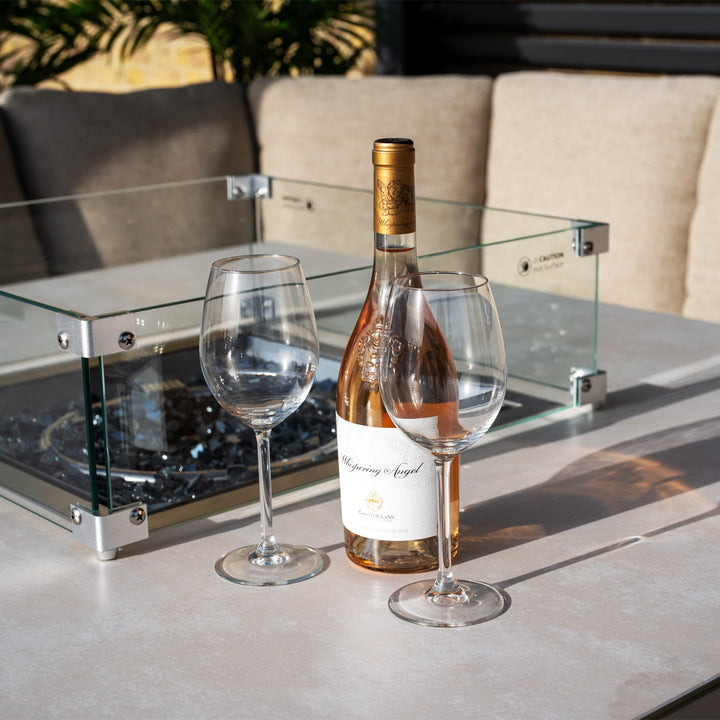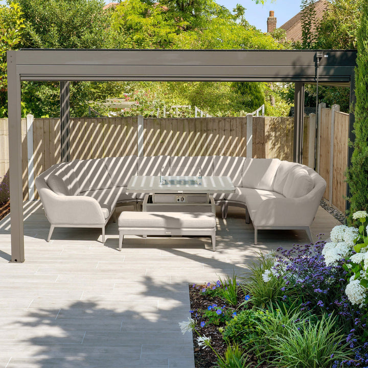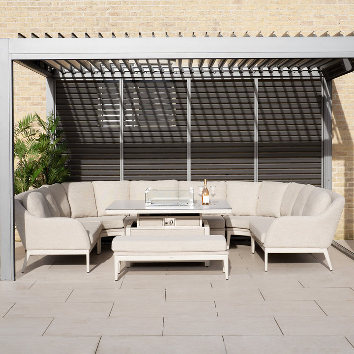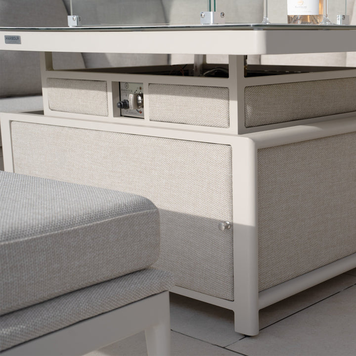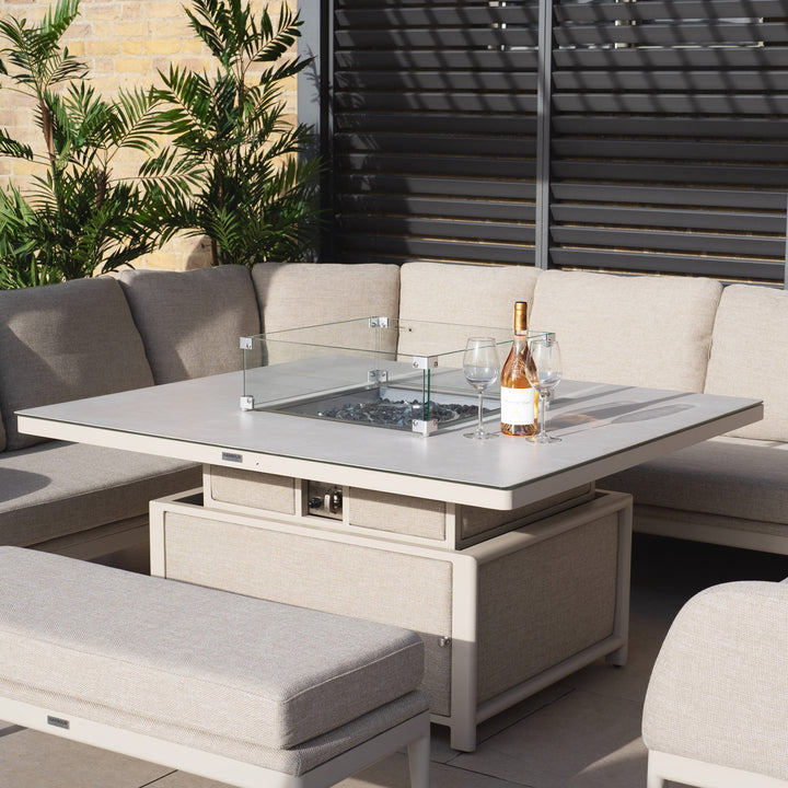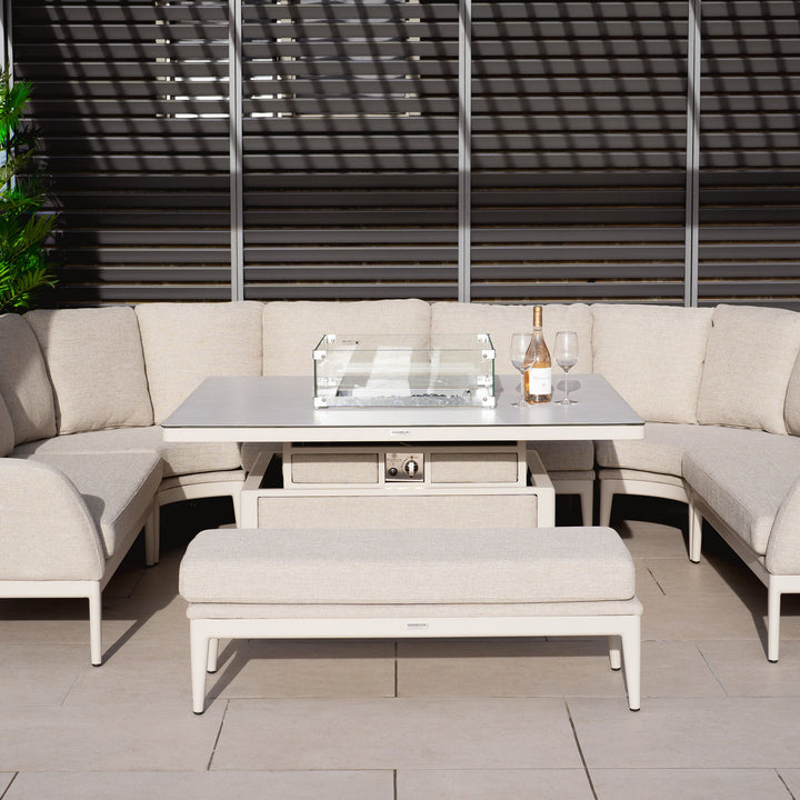 Luna U-Shape Outdoor Fabric Corner Dining with Rising Firepit Table in Fawn