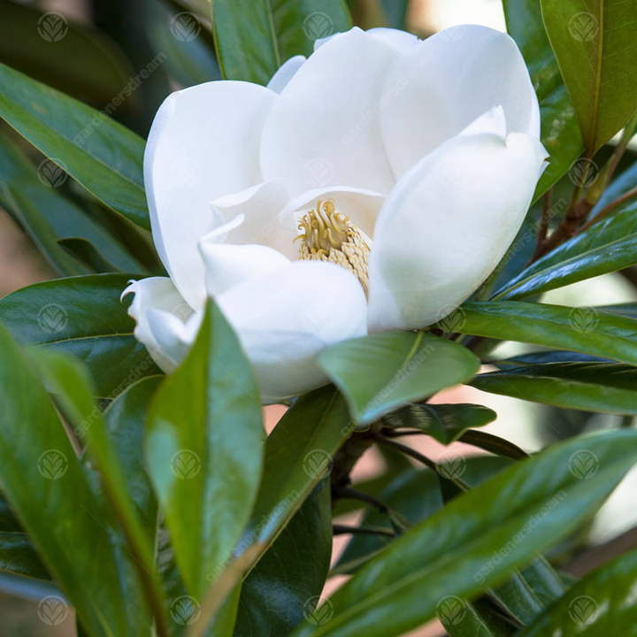 The Magnolia grandiflora ‘Exmouth’ is an Evergreen tree. This variety has large, glossy dark green leaves and large cream flowers. These large flowers are bowl-shaped and heavily scented, they can grow up to 25cm wide. The Magnolia grandiflora ‘Exmouth’ has a bushy habit; this variety is hardy and will thrive in most soil types. The Magnolia grandiflora ‘Exmouth’ is best planted in a full sun or partially shaded location.