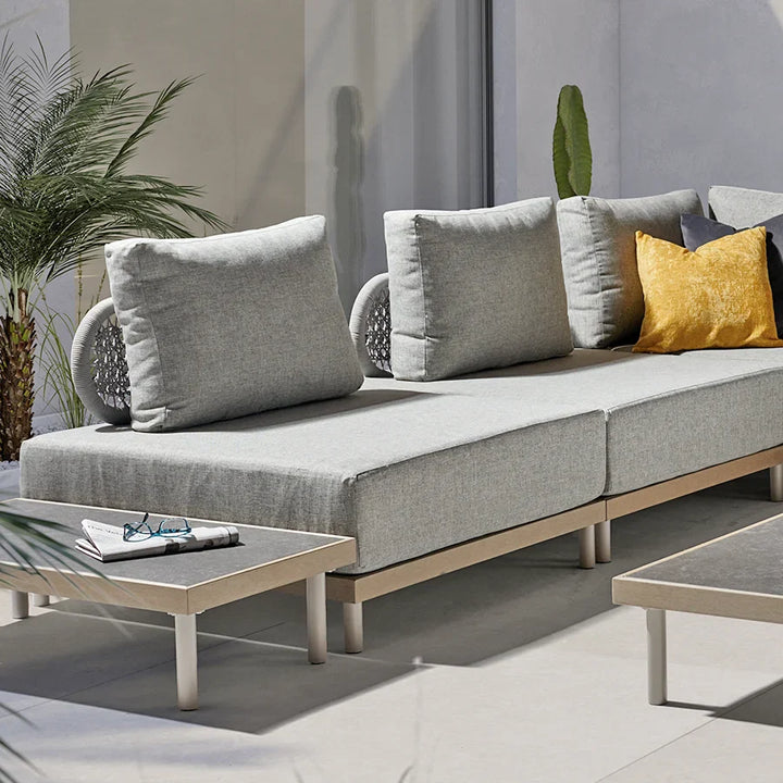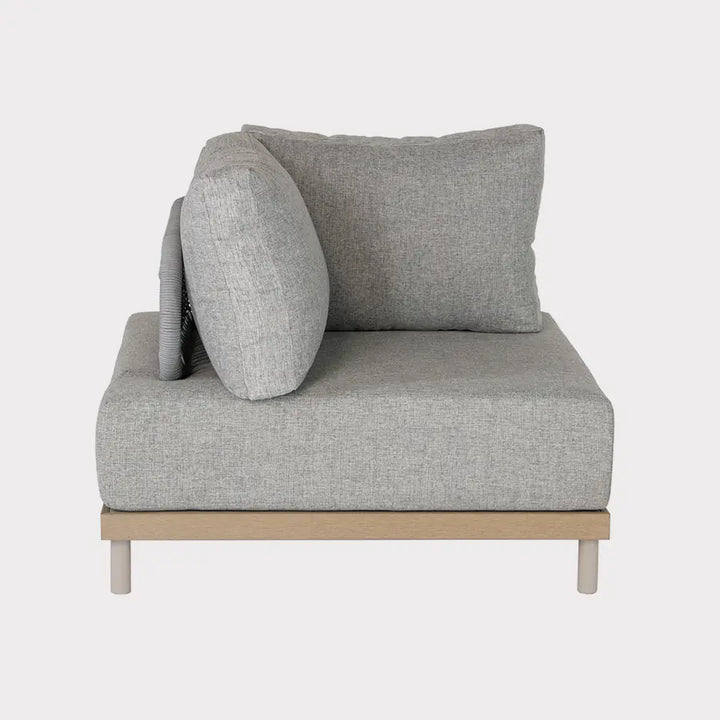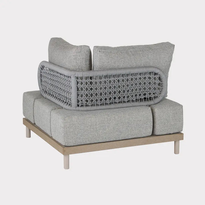 Experience the unique allure of the Mali range with the Mali Low Lounge corner set. Crafted with an aluminium frame and innovative Sumparwood™ material, this corner sofa set boasts exceptional durability with minimal maintenance requirements. The double rope back section adds a touch of elegance, while the deep sumptuous cushions in light grey provide comfort and sophistication. Modular pieces allow you to customize your outdoor seating arrangement to perfection.