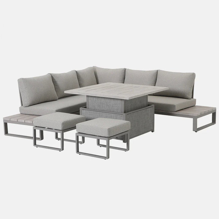 Introducing the Marina Corner Set, a stylish new addition for 2025. Designed with a fresh colourway, this set combines modern aesthetics with everyday practicality. Featuring a spacious corner sofa with built-in side tables, two cushioned footstools and a versatile height-adjustable table, it’s perfect for dining, relaxing, or entertaining. Built with rust-proof aluminium and low-maintenance materials, the Marina Corner Set is as durable as it is inviting, promising lasting quality for your indoor or outdoor space.
