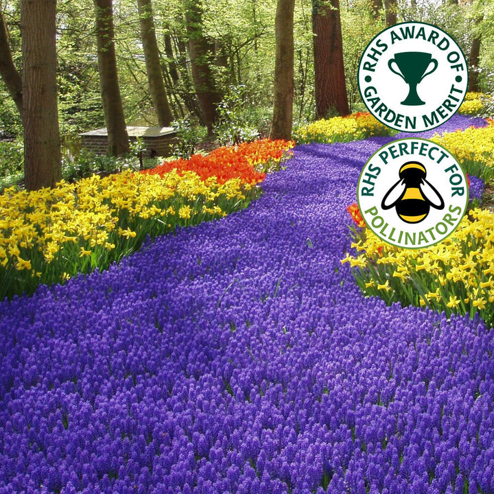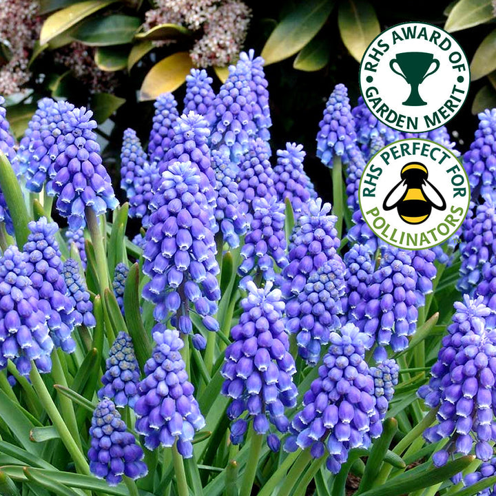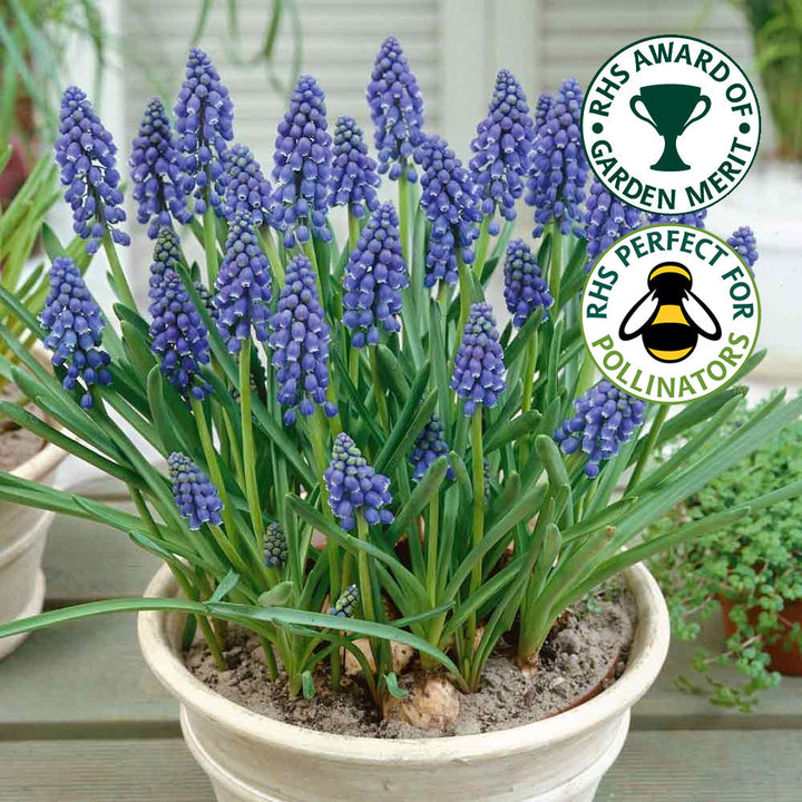 Armeniacum is a strong-growing bulbous perennial to 20cm in height, with narrow, arching green leaves and erect stems bearing dense spikes of white-tipped, deep violet-blue, egg-shaped flowers 5mm in length in spring