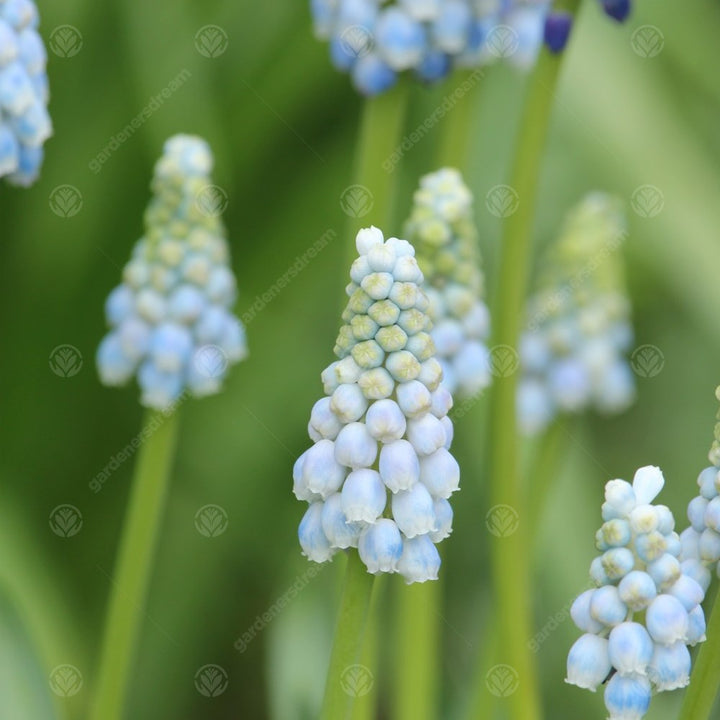 Muscari Peppermint is a distinct newer varietal of perennial flowering ornamental plant with stems or spikes of racemes of densely packed bi-coloured blooms. Urn-shaped flowerheads with the top of the raceme loaded with pale white blooms on the crown and the lower portion is packed with pale blue flowerheads edged in white. Accompanied by narrow, strap-like green leaves.