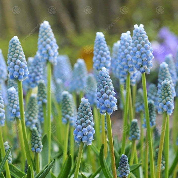 Muscari should be planted in fertile, well-drained soils in mostly sunny areas and are tolerant of some shade. Plant Muscari approximately 3 times the height of the bulb or about 5-10cm deep and about 5-8cm apart for beds. Muscari are generally shorter plants of about 15-20cm and make great plant for underplanting with taller blooming plants or use in pots and containers for accents to use around patios and walkway areas.