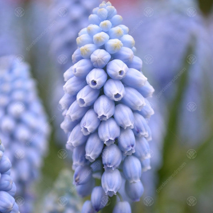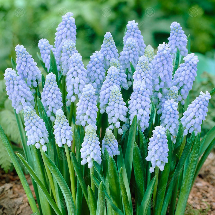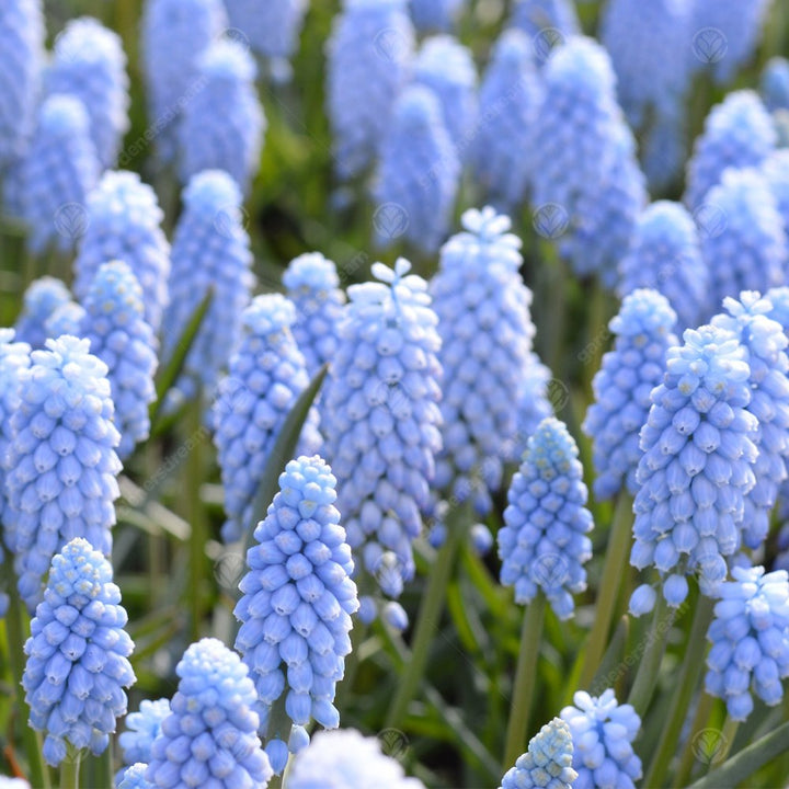 Hardy and like a shower of pale blue flowers, Muscari Valerie Finnis is tolerant of most climates and easy to grow while being a beacon of attraction for gardeners and pollinators alike in the spring season with gracefully beautiful and fragrant blooms. Plant in groups for blankets of blooms creating mounds of wonderful pale blues. Great to use at the front of beds or border or in pots, containers, in rockeries and for underplanting around trees and shrubs.