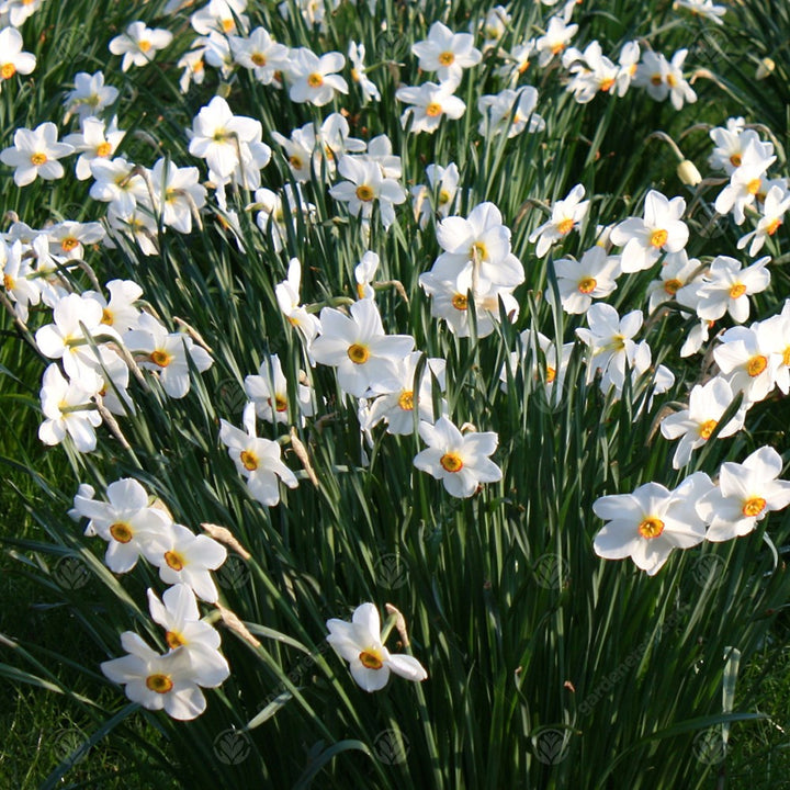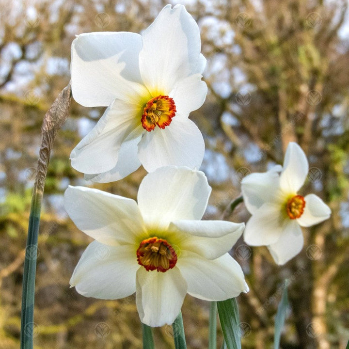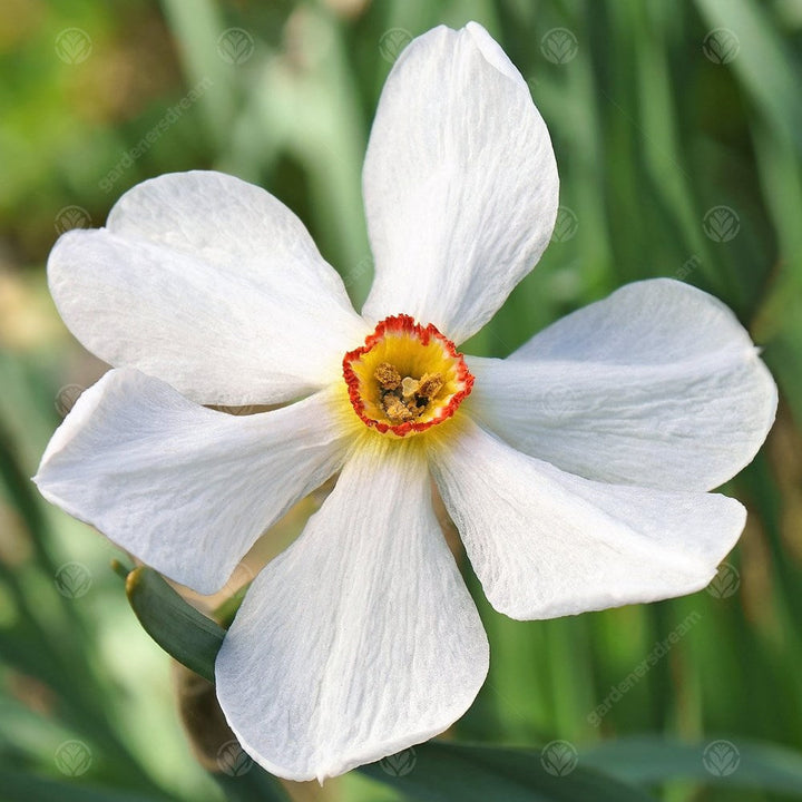 Actaea, also known as Poeticus Daffodil, is part of the Division 9 Narcissus, this group of plants are also known as the Poet’s Narcissus. The brilliant white petals fan out and connect at the base of the small to medium-sized cup. The cup is relatively short and opens to reveal its golden oranges that are frilled and fringed in a bright red colour.