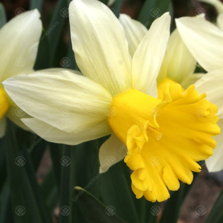 Anniversary Gift is a part of the division 2, large-cupped daffodils. The large, rich yellow cup dominates the bloom and is surrounded by off-white to slightly-yellow tinged petals. The yellow colours in the petals appear like a light stain and help set this bi-colour flower apart from other similar blooms.