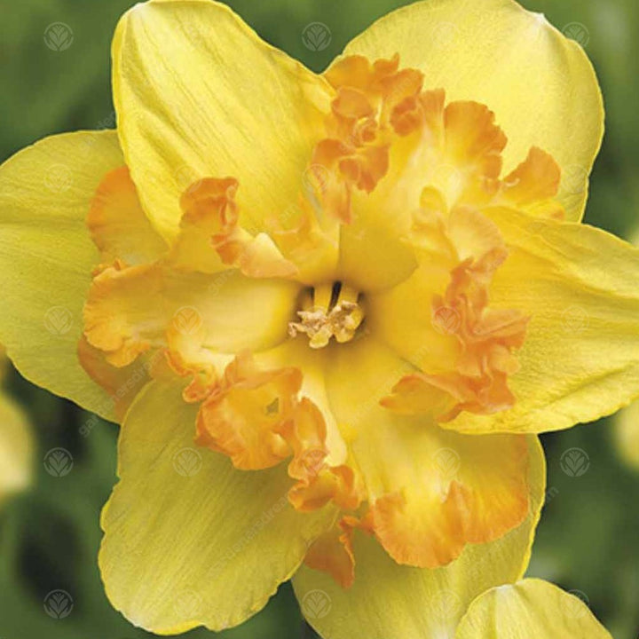 Blazing Starlet is a division 11a, split-cupped collar daffodils which means the orange to yellow-coloured petals gently overlap with the segments of the open corona. The “blazing” part of the name comes from the fiery red to orange edges of the frilly corona segments.