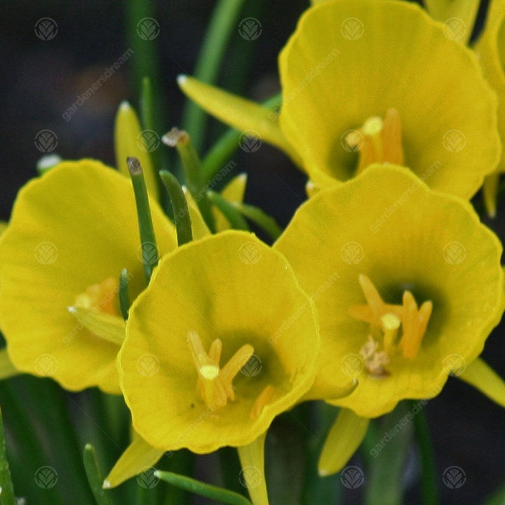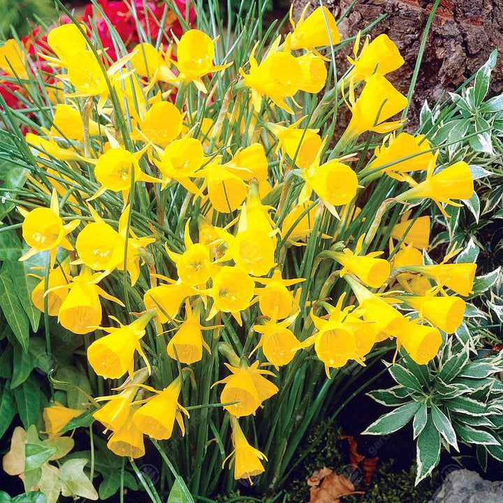 Golden Bells is part of the division 10, Bulbocodium Hybrids with slender and diminutive petals and a bulbous, dominant corona of deep yellow to golden yellow colour. Although there is only one bloom per stem, the wild-style foliage intermixes with multiple stems from a bulb that can produce up to 15 blooms