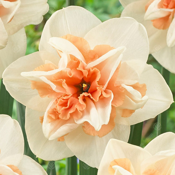 Delnashaugh is an elegant and showy beauty that exhibits the traditional overlapping exterior of a Daffodil. The central part of the bloom is a composed of seemingly interlocking corona segments with petals matching the creamy whiteness of the exterior ones. The corona segments are fantastic hues of peach and rosy apricot.