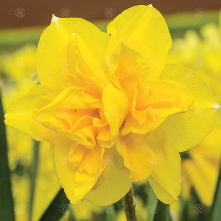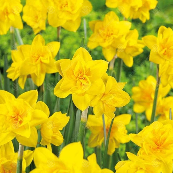 Double Smiles is a division 4, Double Daffodil that is multi-headed with typically two to three blooms per stem. The delightful yellows of the multiple petals present whorls around central cups segments which are deeper golden orange colours and approximately half the length of the interior petaloids.