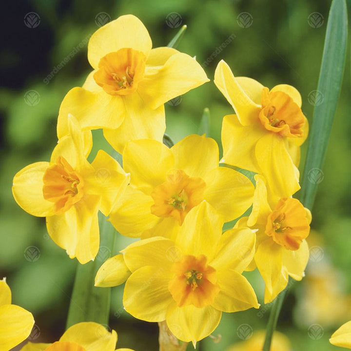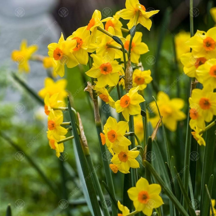 Falconet is a division 8, Tazetta Daffodil with typically 3-5 blooms on a stem, sometimes up to 8. The blooms are energetic yellow colours with a cup that can varies from a deep orange to red colour.